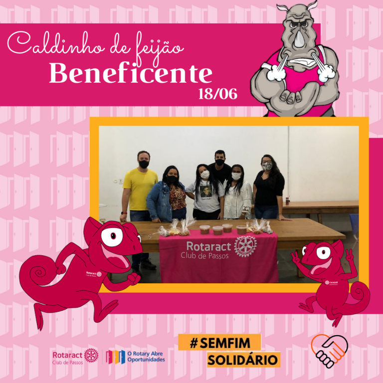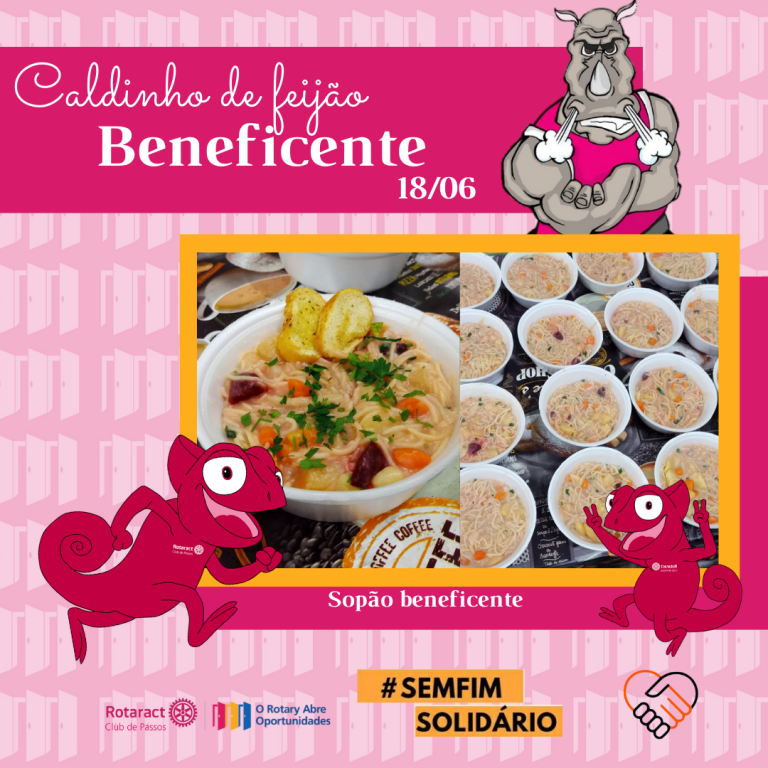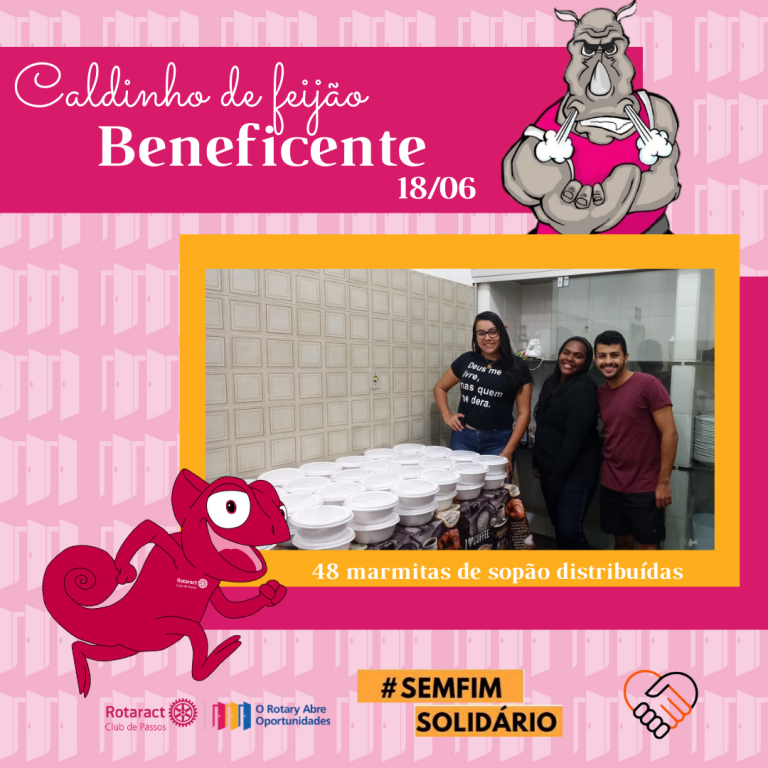 No último fim de semana, o Rotaract Club de Passos junto com o grupo @semfimsolidario realizaram o projeto CALDINHO DO BEM e SOPÃO SOLIDÁRIO. Com o apoio da comunidade e comércio local foi possível arrecadar alimentos para realização do projeto que consistiu na venda de caldos de feijão, resultando na venda de 68 caldos. Todo lucro foi convertido em cestas básicas e, assim, 11 famílias carentes foram beneficiadas. Com o restante das doações o grupo conseguiu fazer 48 marmitas de sopão que foram distribuídos as pessoas que vivem em situação de rua em Passos, MG.